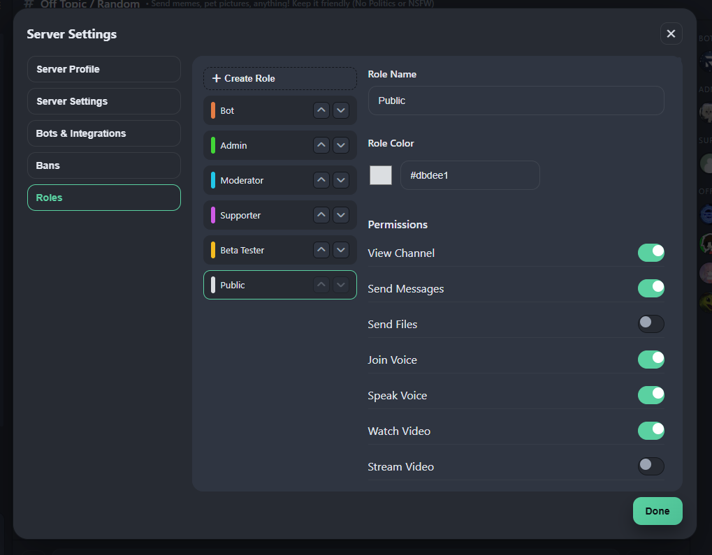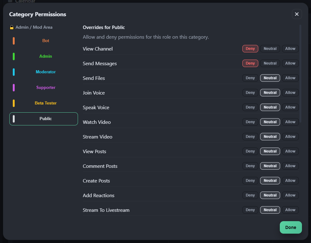Maybe you want an admin area, or members-only area, or VIP area – we got you covered. Apply channel and category-specific permission overrides per role!